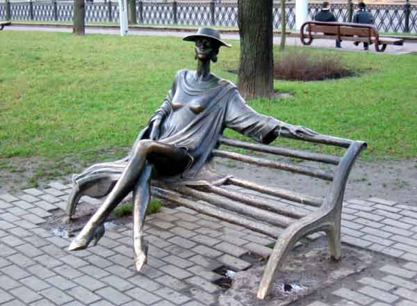 Перед Вами-первая скульптура так называемого "паркового жанра", появившаяся в городе Минске несколько лет назад. В.И.Жбанов вспоминает: "Образ родился у меня совершенно внезапно, всего за каких-то пару часов. Миниатюрная работа стояла затем в моей мастерской несколько лет и часто обращала на себя внимание гостей. Отлить ее в бронзе не представлялось случая. " "Мне неожиданно повезло в связи с реконструкцией Михайловского сквера, Городские власти решили украсить ее скульптурами и предложили мне, наряду с некоторыми другими художниками, участвовать в конкурсе. К моему удивлению, я выиграл! Я был счастлив, я даже поверить не мог, что такое может произойти. " Скульптура "Незнакомка" установлена в 1998 году.